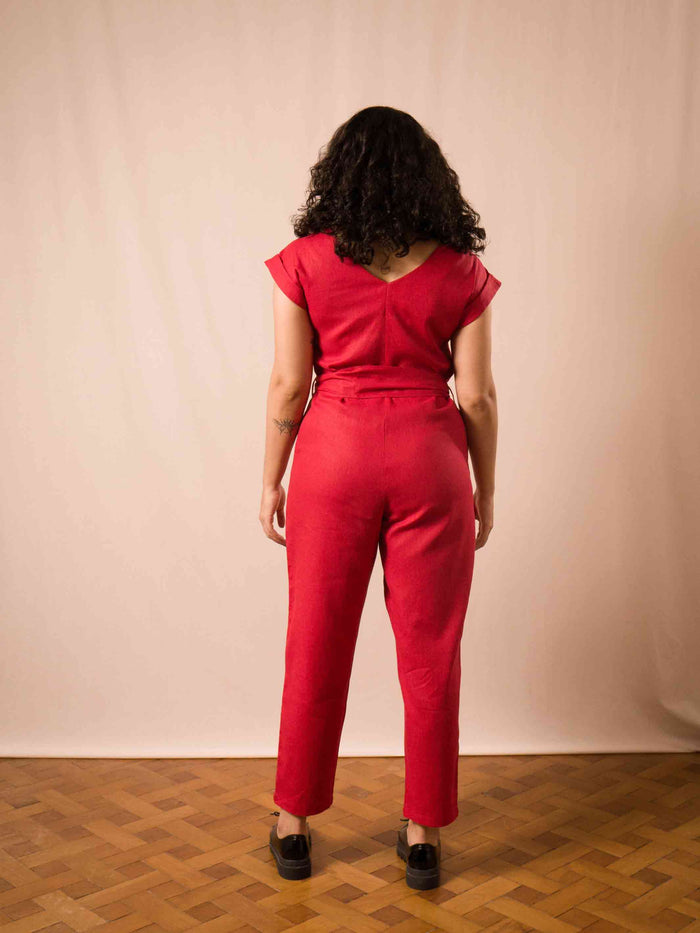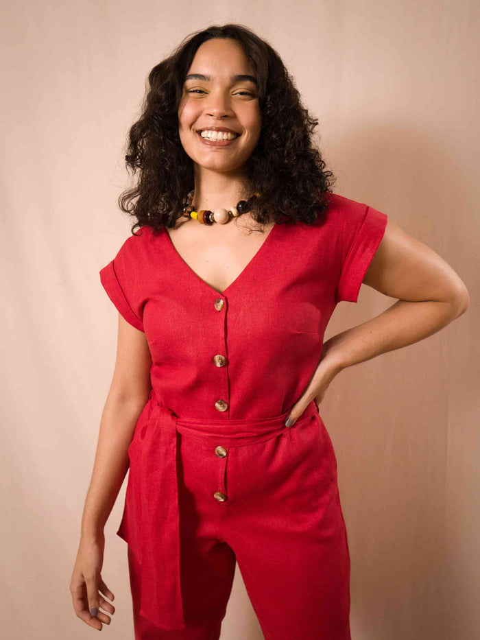 O macacão Edna é perfeito para quem gosta de uma peça mais soltinha, mas não abre mão de uma modelagem acinturada. Tem o fechamento todo por botões (Alô lactantes♥️), bolsos faca e acompanha uma faixa removível para quem ama dá aquela acinturada, além de uma dobra na manga que dá um charme especial. Funciona super bem no dia a dia (com tênis, rasteira, ou salto) ou também para uma ocasião especial ✨ Precisa falar mais? 😍